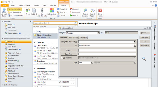 While this tab is open, you might also want to click on the Search Tools icon, then choose Search Options to add further controls to your Outlook searching.